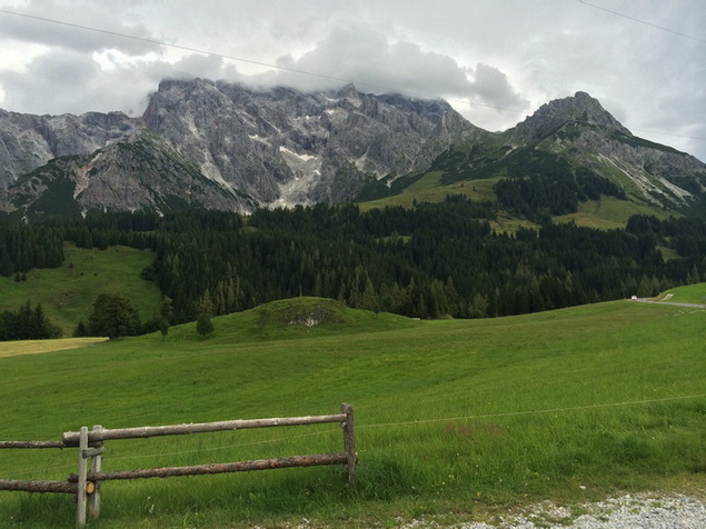 Graz után a 77-es út felé vettük az irányt, ami csodás helyeken kanyarog a csúcson lévő étteremig. Természetesen mi nem részesültünk a felettébb csodás táj látványából, mert beborult és innentől kezdve úgy is maradt.