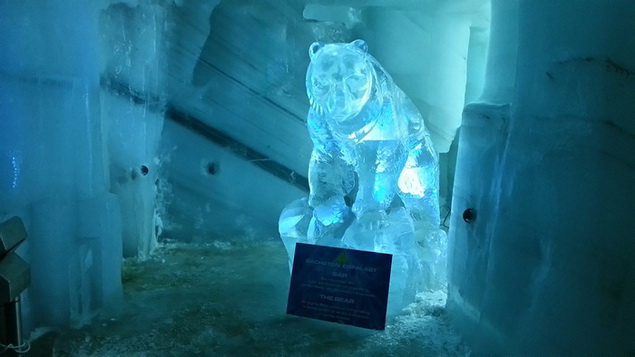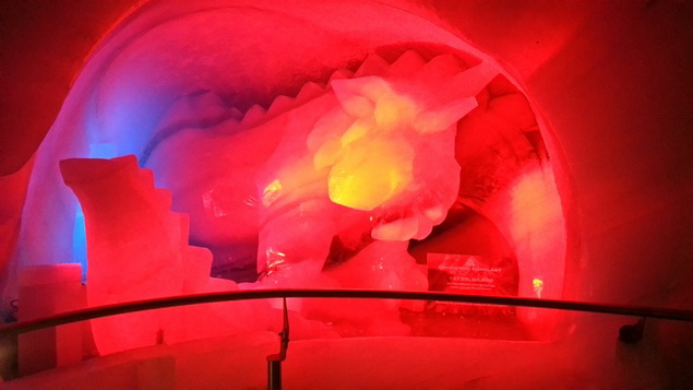 Ezt követte a jégbarlang, ahol különféle jégből faragott, megvilágított szobrokkal, és a gleccserekről szóló információkkal szórakoztatták a látogatót.