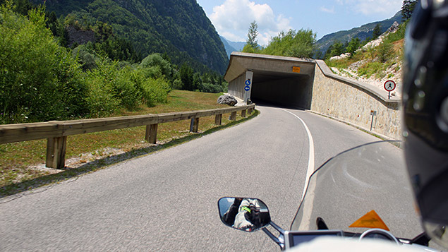 Amennyiben nem akarok felmenni az autópálya fölé Kranjska Gora felé menet az unalmas Jesenicébe, akkor Radovján keresztül vezet egy rövidebb út Mojstranaba. A meglepi az volt, hogy ez az utacska szinte teljes hosszában kemény burkolat nélküli, bár meg kell hagyni, hogy a legjobb fajta símára hengerelt murvás út. Tigris az ilyeneken nem fickándozik, sőt erősen visszafogja magát mafla nagy súlya miatt, ami könnyen válik nehezen kormányozhatóvá az apró köveken. Most inkább a futófelület közepét koptattuk. A táj viszont nagyon szép, mindenkinek javaslom, hogy menjen neki bátran ennek az útvonalnak. A Garmin néha el akar vinni a csúnya susnyásba, de ne hallgass rá, ragaszkodj a minőségi hengerelt murvához és hamarabb célhoz érsz.