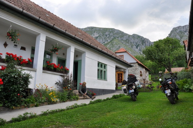 Az 1-est Sebesvár felé hagytuk el a D103-ason, ahol pillanatok alatt bent találtuk magunkat a Kalotai hegyek között kanyargó köves makadámúton, ami Székelyjóról visz Kalotaszentkirályra. Végre lent voltunk az aszfaltról, eltűnt mögöttünk a civilizáció, és kicsit óvatoskodva kanyarogtunk a pingpong- és teniszlabdányi kövekkel borított makadámon a gyönyörű tájban. Csak egy cigány kordé volt az úton, ahonnan a rajkók lelkesen kapkodtak utánunk, hogy megsimogassák a szép motorokat. Az első kisebb baleset is ezen a szakaszon történt, amikor kicsit elszámolva a felpakolt vasak szélességét, a dobozok összeakadtak és Attishék a szemközti domboldalon kötöttek ki hasmánt. Az egyik aludoboz leszakadt a Stromról, és alaposan eldeformálódott. Szerencsére kő akadt bőven, így volt mivel helyrekalapálni a cuccost, egy tartalék hevederrel pedig hibátlanul a helyére varázsoltuk az önálló életre kelt koffert. Kalotaszentkirálynál tértünk vissza az aszfaltra, ahol az éppen csak levonult árvíz rombolása kis híján visszafordított bennünket. A Kalota-patak ugyanis – kb. 2 métert emelkedve elsodorta a hidat és az út felét. A helyiek bátorítására azonban tovább gurultunk Magyarvalkó felé, hogy megnézzük a nagyhírű, helyi református templomot. Már a falu utcáján mondták az emberek: keressük a plébános urat, ha visszaért Hunyadról, megmutatja a templomot. Szerencsére otthon találtuk, így nagyon lelkesen vezetett fel bennünket büszkeségéhez, Isten sok évszázadot megélt, festett, fakazettás mennyezetes házához. Ízes magyarsággal mesélt Szent László aranyainak legendájáról, az öreg temetőről, a román állam törekvéséről, hogy a magyarlakta falut elrománosítsák, és még sok minden másról. Jó is és kicsit szomorú is volt hallgatni. Kissé át is kellett terveznünk az utat, hogy még időben a szállásunkra érhessünk.