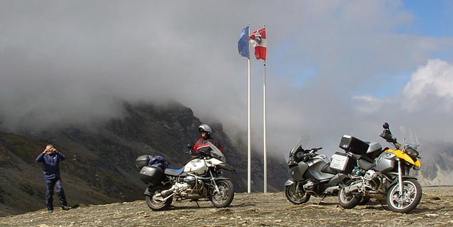 Flims-Disentis/Muster-Andermatt útvonalon haladunk, Andermattnál északnak vesszük az irányt, Wassen-nél nyugatra, a Sustenpasson akarunk átvágni. Az idő erősen borult, az eső rá-rá kezd. Egy gleccsernél fotózgatunk, egy régi szép R100-ast hajtó motorossal váltunk pár szót. Én megcsodálom az abszolút vízhatlan zöld gumicsizmáját. Bármely traktoron megállná a helyét. Alagút következik, aminek a vége felé valami egészen különlegeset látni, a túloldalról köd (felhő) hömpölyög be, mintha tejfölbe motoroznánk bele. Horrorfilm rendező álma. Szerencsére hamar alá kerülünk, egy kanyarban megállunk fotózgatni. Speedesek döngetnek felfele. Na mindjárt lassítotok ti még gyerekek.