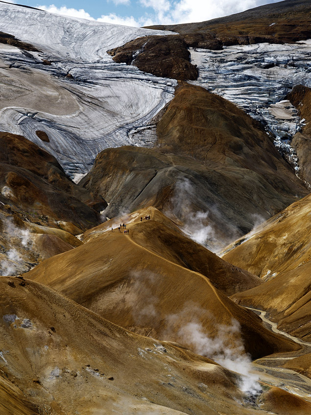Másnap az F 35-ös úton folytattuk utunkat, amely két gleccser a Langjöküll és a Hofsjökull között halad északi irányba. A jégfolyamokat csak távolról lehet megszemlélni, de így is elképesztően szépek és hatalmasak. Egy rövid kitérővel értük el a Kerlingarfjöll nevű hegységet, ahol a tűz és víz együttes munkája elképesztő látványt nyújt. Túránk során ez volt az egyik legkiemelkedőbb látnivaló.
