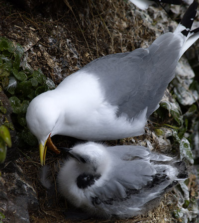 Latrabjarg az otthona a hatalmas sirály és puffin kolóniáknak, ezért készítettünk egy pár fotót a madarakról, ahol a kicsik nemrég keltek ki a tojásból, mert a tollazatuk repülésre még nem volt alkalmas és a szülők folyamatosan hordták az ennivalót az éhes csőrökbe.