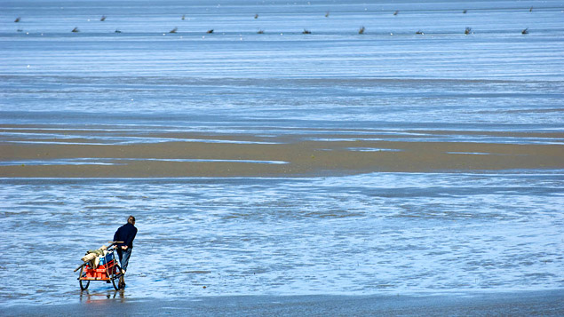 Minden a kerékpárosokat szolgálja, rengeteg tároló, kiváló utak és néha hátszél. Ami ahhoz szükséges, hogy a kerékpártól elszokott motoros vissza is tudjon jönni a szálláshoz. A torkolathoz érve rácsodálkoztunk a hatalmas, kikötésre készülő teherhajókra. Globális kereskedelem: elképesztő, több száz konténer egy hajón. Vasárnap délután rengetegen sétálnak a gátakon, senkit sem zavar a 20-30 km/h-s szél. A nap mindenért kárpótol. Visszaindultunk szállásunk felé, ahogy a tengerhez érve láttuk: visszatérnek a reggeli lovas kocsik, lovasok, gyalogosok – igyekeznek a part felé. Hamarosan megjön a dagály és víz alá kerül az eddig útnak használt tengerfenék.