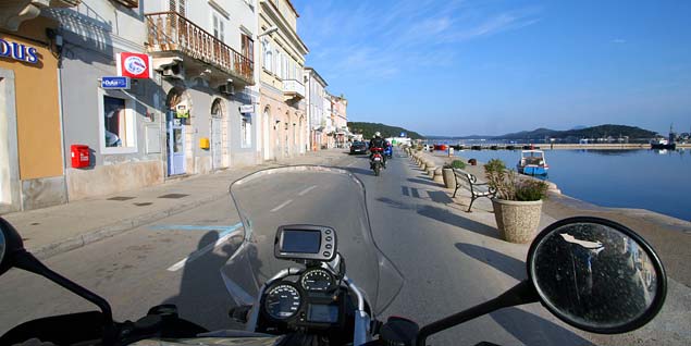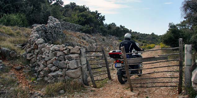 Az olasz motorosok is itt parkolnak, akikkel együtt utaztunk a kompon. Az Adventure-ös, akiről kiderült, hogy gyakran jár ide, tippeket adott nekünk, hogy merre keressünk aszfaltozatlan mellékutakat. A külső kikötő (Marina) után a partot követve egy 15 kilométeres hegyi úton juthatunk el Valunig. Az utat hamar megtaláltuk, és csak egyszer tértünk le róla balra egy meredek, gyalogútra, ami rövidesen egy kapunál ért véget.