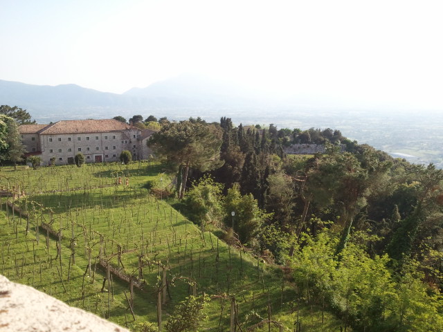 Az órát nem is nézve, kirándulósra fogva a tempót (sokszor a gyakori útfelszóródás és úthibák miatt) csodáltuk a tájat hosszú órákon át, meg-megállva egy-egy lélegzetelállító panorámát fotózva, mikor az órára nézve már öt óra közelében járt az idő. Valójában nem tudtuk pontosan megbecsülni, milyen messze lehetünk Nápolytól, ezért elkezdtem egy kicsit húzni neki. Egészen a következő útjelző tábláig, ami szerint már csak 85 km-re voltunk Nápolytól. Épp mellettünk magasodott egy hatalmas hegy, melynek csúcsán egy erődszerű hatalmas épület trónolt, ezért Cassino-nál lekanyarodtunk a főútról, s egy helyit megkérdeztünk, hogy jutunk fel az erődhöz? Gyorsan megtaláltuk a szerpentint Montecassino-hoz, Szent Benedek, a bencés rend megalapítójának nyughelyéhez. Ugyan a monostor már több, mint 1.400 éves (Szent Benedek 529 körül alapította), de a második világháborúban az Amerikai Légierő porig bombázta, csak az altemplom maradt meg.