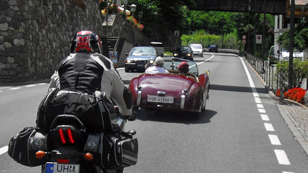 Most egy pár gondolat erejéig csöndbe maradok, és a képek beszélnek helyettem. De nehogy valaki más sztorit találjon ki hozzá, hát gyorsan ideékelem. A mai cél a Comói tó, meg pár apró látványosság ami közte van. Például a pompás bordó sportkocsi ott Laci előtt, aki egy kicsit megpróbál borsot törni az orrunk alá. Dallamosan énekelteti a koros gazda a talán vele egy idős autót. Még jelentős megpróbáltatások elé állítanak a helyi “pár tonnás kavicsokat” szállító dömperek. Szerencsére a Stelvió-ra már nem jönnek fel, mert hogy mi arra tartunk. Hogy közel járunk, azt mi sem jelzi jobban , hogy az országút forgalmának nagy részét nyeregben ülők teszik ki. Ez alól csak az a baltás mikrobuszos a kivétel aki, anélkül hogy ezt titkolná, nyíltan tőr az életünkre a szerpentinen. Középre húzza a kormányt mutogat, dudál. Laci talál egy rést könnyeben túl van rajta, én jönnék, de még éberebben terelgeti a dobozt. Valahogy nekem is sikerül beszúrnom, egy óvatlan pillanatban. Kezem rázom, jellegzetesen egy fújam kivételével szorítom ökölbe a kezem. Persze hogy fellélegzek, hiszen utassal , meg hullámos féktárcsával , nem olyan felhőtlen az ilyen manőver.