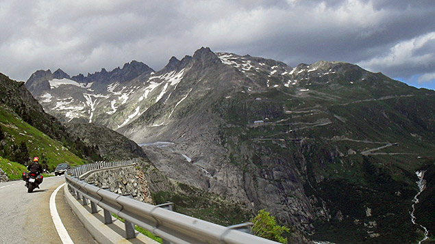 Oly gyorsan átérünk Svájcba, hogy már “kénytelen” vagyunk itt tankolni olcsóbban. Igaz majdnem drágára sikeredik, mert Laci a motorját tolva elhullajtja bukót. Utánakap, de közben a motor meg lassan átbillen a másik oldalra. Ekkor ÉÉÉÉÉN, mit akinek bekapta a fogaskerék, utána kapok, és az utaskapaszkodónál fogva visszarántom. Majd közlöm Lacival, hogy ezt többet ne gyakoroltassa velem! A helyi közértbe még púposra tömjük a táskákat, hogy ne üres kézzel érkezzünk látogatóba. A 2-es főút Luganó tava fele nem túl izgalmas. Tötyörgő emberek mindenhol, és még ekkora “tempónál” is képesek valahogy ezen a 2×6 méteres úton összeütközni. Minket meg az egyetlen normális kanyarunktól megfosztani a helyszínelés miatt. Azért elérve a tavat újra izgalmassá válik a túra . Louise átfényképez a túlpartra ahol Campione kicsiny városállama kínál az ott élőknek adóparadicsomot. Pár óra kínlódás után egy kőfejtő mellett próbáljuk meg összeszedni magunk, és felhúzni a figyelmünk a következő Furka Pass-ra. Ez is megvolt ugyan tavaly, de nem mondanám hogy unnám annyira mint az otthoni “pápai” karikát! Tökéletes az idő, alacsony a forgalom. Itt az ideje hogy bepótoljuk amit ugyan nem lehet, de legalább erőfeszítéseket teszek rá.San Gottardo felől vágunk neki a Furka passnak. Megcsípek pár jó ívet! Nem fordulok ugyan az indexeken, de végre élvezem! Főleg hogy a nyár közepébe, július 17-et írunk, megint egy kis tél keveredik. Itt-ott foltokban hó, és a hőmérséklet is esik 10-15 fokot ahogy csúcsra törünk. Akad is egy parkoló ahol kedvünkre kibaromkodhatjuk magunk a hófallal, csak az bosszant, hogy a magas patán jól odaverem a leömlőket. De ekkor már ki nem … Laci a plexit stoppolja bukóján, mert néha kiakad.