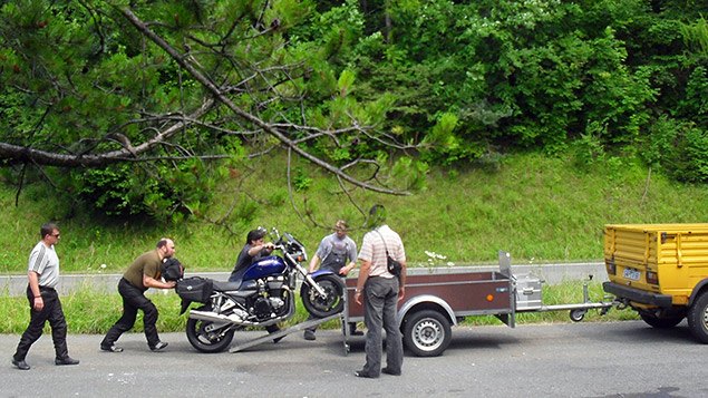 Louise hívja gyorsan az ADAC-t. Ilyenkor felteszik a szőke nős kérdéseket, hogy van-e benzin a tankban, rajta –e gyújtás, de ekkor átveszem a telefont , és elkezdem ecsetelni hogy 20 liter benzinem van, a elektromos pumpa jár, de nincs nyomás a rendszerben, és hogy másik pumpával meg működik. És kérem , ha van mód rá, akkor hozzanak egy 20 literes edényt üresen, hogy szétszedhessem, mert nem akarom az erdőbe leengedni. A barátok ismét velem vannak, kényeztetnek a sorba egymás után a kellemes megjegyzésekkel. Ugyan nem ezért, de felajánlom nekik, hogy még elérhetik a következő szállást olaszban, menjenek, de ekkor szinte egyként vágják rá, hogy együtt jöttünk, együtt megyünk. Ehhez aztán nem igen tudok semmit hozzáfűzni. Kisvártatva, megérkezik a mentés is. Nem igazán az amire számítottam, de megnyugtatnak, hogy bevisznek az autószerelő műhelybe a faluba, ott többet tudnak értem tenni. A srác nem túl eszes, kicsit lassú…pl ahogy képen látszik elém áll mikor ugranék fel a motor mellett az ufóra. Aztán sikerül a kormányhevedert úgy felraknia hogy az elmozdítja a bal oldali kormányszektort, elnyírva a pozicionáló pöcköt a kapcsolóházban. Én nem igen tudok neki segíteni, mert nem szoktam ufón szállítani a motor, meg nem igen vannak olyan barátaim, akik ilyenre vetemednek, és azt hiszem nem is igen lesznek. Ez a motor a KRESZ szerint is önerejéből képes eljutni bárhova, nem kell neki ehhez segédeszköz kivéve ezeket a pillanatokat. Pár perc kínos autózós után, mikor 2 szer fullasztja le a furgont, megérkezünk a szervizbe. Azt feleslegesen várom el hogy ott bármit is csináljanak vele, hiszen nem gondolják hogy ők is meg tudnák csinálni. A Suzuki szervizt hívják, hogy ott másnap meg tudnák nézni, meg alkatrészt rendelni. Ezt nem fogadom el, mert tisztában vagyok hogy magam is meg tudom csinálni, és nincs módom 100 eurókat fizetni szervízdíjra, meg új alkatrészre. Így kérem, hogy miket és motort szállítsanak vissza Münchenbe. Ekkor már messze vagyunk attól hogy majd ott helyben megoldom, aztán mehetünk tovább. Volna még pár kedvező lehetőség csereautó, szállás, de húzzunk haza, azt majd pénteken új sor nagybetű…Megérkezik a következő ADAC-s a pickup utánfutót vonszolva maga után, hogy tetszhalott motoromat “tenyerén“ vigye haza. Louise-zal mi is beülünk a teherautóba, közben elered az eső. Többiek még visszamennek a tett színhelyére, mert féltelezhetően ott hagytak valamit. A mi angyalunk beszédes, ismeri a tavak környékét, sokat bringázik, motorozik arra. Kedves ember még félre is állunk az egyik parkolóban készíteni pár képet a beszámolóba, és a többiek is akkor húznak el mellettünk.