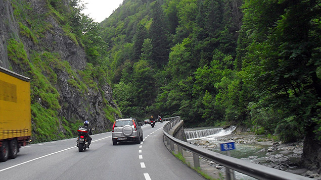 És akkor egyszer csak összetorlódunk egy kanyargós részen. Hol máshol? Ez olyan Murphy törvény, hogy szabadon flangálhatsz a élménytelen egyenes részeken, és amint eljő az élményteli rész, tuti hogy utolérsz valami ügyetlen csoportot, amit nem lehet biztonságosan magad mögé utasítani. Itt egy busz kínlódik , meg mögötte mi türelmetlenkedünk. És az a olaj leeresztő tepsi magasságú autó ami igen mérges kis erőforrással harsog előttem. És persze hogy elbukom ezt a részt. Kiérünk a síkságra mire mindenkin átverekedjük magunk, de sportkocsi rugalmassága egy picit lenyűgöz megrögzött motorosként is.