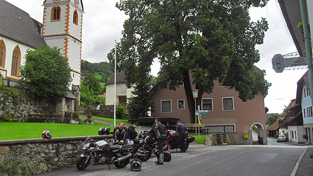 Vasárnap. A gépen nyomtalanul múlik el az éjszaka, csak a lelkesedésünk hagy alább látva gyülekező felhőket. Iránynak Szlovéniát, és az olasz Pó síkságot választjuk, hogyan Udine felől kapaszkodjunk fel az Alpokba. Szlovéniában Laci fut túl egy íven virágot szedni. Szerencsére a pirosban pompázó táskái azonnal felfedik kilétét. Eldugott kis hegyi falukon át haladunk tovább . Az esőruhát már csak babonából sem vesszük le. Kropa is utunkba esik. Ugyan oly parányi, hogy alig hogy betelnénk nyugalmával, már el is hagyjuk felfele kígyózó hegyi ösvényen. Azaz hagynák, ha cserfes leányzóként nem hívogatna, hogy forduljunk utána. Mikor a magaslatról visszakacsintunk az objektíveken keresztül, szívünk egy darabja örökre ott marad. Az élményt teszi még hangsúlyosabbá, hogy szakasz nyálkás csúszós, mintha élvezné hogy motorozunk rajta, ugyanis nem sokan hágnak fel erre. Tormezzo előtt még megállunk a kedvenc szlovén kutunknál. Kedven, hiszen már másodszor is ezt választjuk, mikor erre járunk. Az idő javulni látszik, erősen foglalkoztat mindenkit az örök gondolat, hogyha vajon most levesszük a esőruhát akkor ismét esni fog? Erre gyorsan megjön a válasz, mert mire mindenki kihámozza magát a super-overálból a mellék helységben, hogy szobatiszta maradjon, addigra megint elered. Én még szöszmötölök egy kicsit, na mivel is!? Oh igen a lánc olajozóval! Ugye mindenkinek van keresztje, nekem ez jutott ! Töltök bele kenőanyagot, mert kifogyott, bár ez a láncon nem látszik, hogy oda is jutott volna, de máshol kellemesen alváz-védőzte a motort. Na többit majd este megoldom.