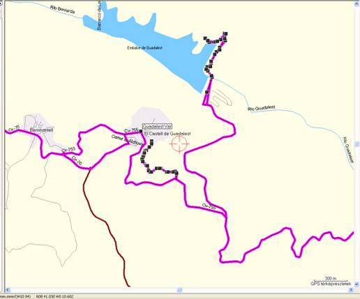 Guadalestnél megint tesztelhettem egy kicsit a GPS-t. Mutatott egy utat le a várból a víztározóhoz, de közvetlenül a kiválasztott út mellett volt egy másik utacska is. Na, itt mutatkozott meg az, hogy csak a hang-utasítással hogy el lehet kavarodni. Én ugyan ilyet nem használok, de nem is igazán néztem meg rendesen a kijelzőt csak azt, hogy a következő kanyarnál balra kell fordulni.